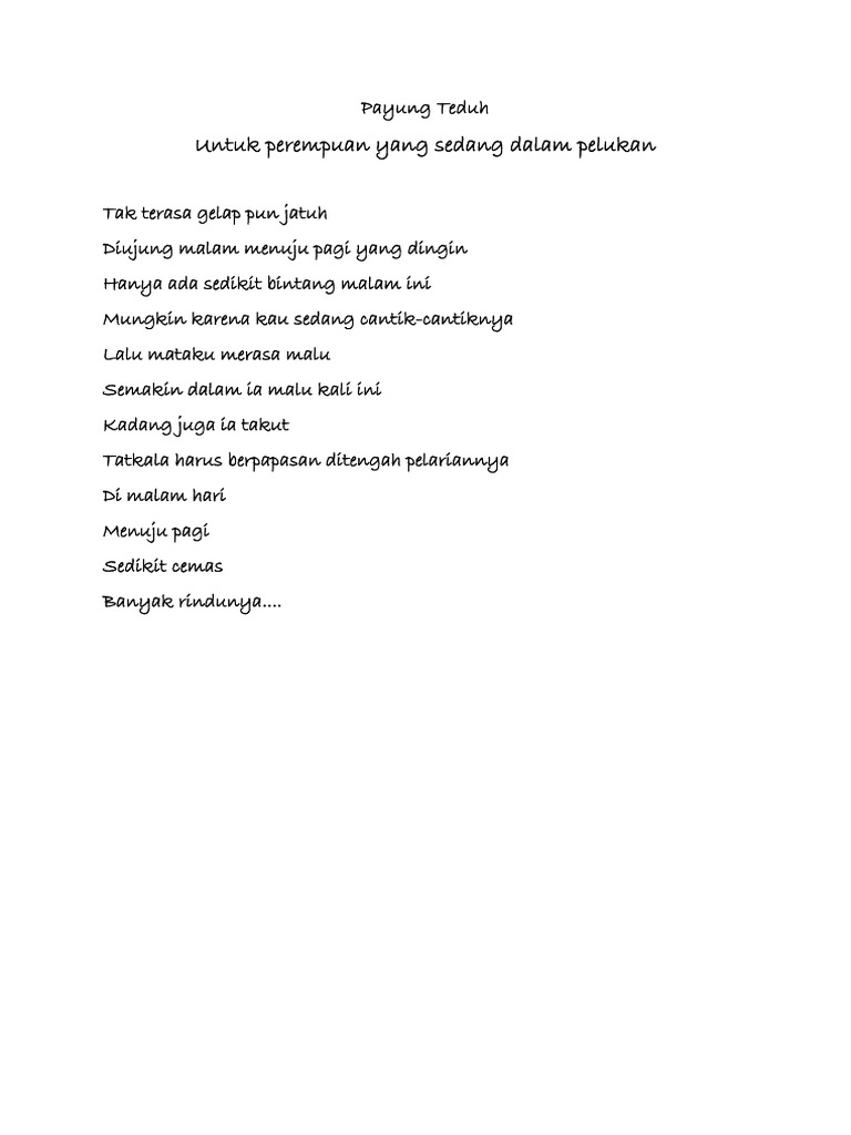 Lirik Lagu Untuk Perempuan yang Sedang dalam Pelukan - Payung Teduh. Lirik Lagu Untuk Perempuan Payung Teduh Tak terasa gelap pun jatuh Diujung malam menuju pagi yang dingin Hanya ada sedikit bintang malam ini Mungkin. TRIBUNTERNATECOM - Berikut lirik dan chord kunci gitar lagu Untuk Perempuan Yang Sedang Dalam Pelukan - Payung Teduh.