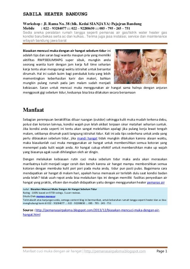 Manfaat cuci muka pake air hangat sebelum tidur. Faedah di balik terlatih basuh muka sebelum tidur Membersihkan muka begitu berguna buat mempertahankan kesehatan kulit tapi gak butuh sering-sering. Kulit muka yang masih tertutup oleh make up akan mengganggu. Tapi pada kenyataannya mencuci muka dengan air saja di pagi hari memiliki banyak manfaat loh.